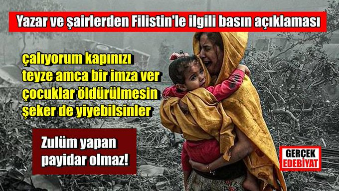 Türkiye'nin önde gelen bir grup yazar ve şairi, Filistin'de yaşanan insanlık dramıyla ilgili tepkile...